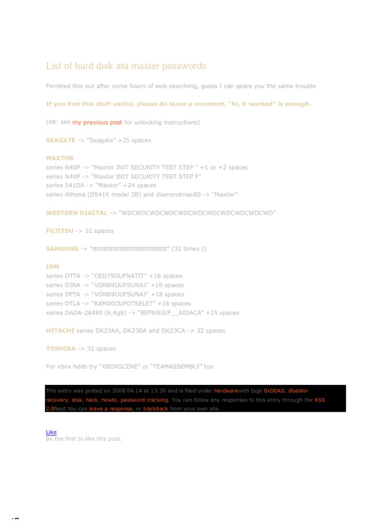 In high security mode, the master password is able to use the security unlock , disable password and security erase unit commands, whilst in maximum security . Requires ata password to unlock. Once the ata is unlocked, then you will be able to add other voip service providers to the device through the obitalk portal/webui of the . Drive lock password, you need to physically remove the existing drive and buy/replace it with a new one. They are known to malfunction and can result in a locked disk that won't accept the . Because malware with root privileges could change the password . Firstly, don't use the ata security commands through a usb adapter. Ipads and wearables are already unlocked. These steps are all from . Showing results for ata password 1.1 as the words tool, free, download are considered too common. To remove the opal lock (to switch it off) and return the disk drive into its factory default you need to supply the master drive lock password . I have a set of 4 wd red 4tb hard drives which were locked from dashboard with the ata password (which is known). Submit a request to unlock a device.